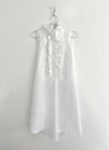 A timeless cotton piece in clean crisk 100% cotton. The sleeveless cottonvdress from TEIJA has pin tuck detailing at back and front. A ruffle edges button placket, as well as hand smocked  ruffled collar. This below the knee unlined cotton dress is one of our hand made treasures that you can order bespoke with  only 2 week leadtime made in our UK workshop. Saffea dress is a versatile piece that you can style with leather sandals or smaller leather pumps or flats.