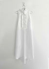 A timeless cotton dress in clean crisp 100% cotton. The sleeveless cotton dress from TEIJA has pintuck detailing at back and front. A ruffle-edged button fastening, as well as hand smocked neck. This midi length unlined cotton dress is one of our hand made treasures that are made in our UK workshop. Safa dress is a versatile piece that you can style with leather sandals or smaller leather pumps or flats.