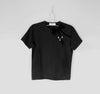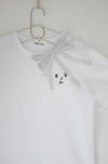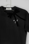 This dreamy Juliet top is slightly boxy Japanese 'boyfriend' cut. The playful velvet bow design finishes the look into day to night piece, ready from work to some stargazing. Available in white with silver bow and black with black velvet bow. High quality cotton jersey. Style with our trousers and relaxed jacket or knitwear. Or gift for somebody special.